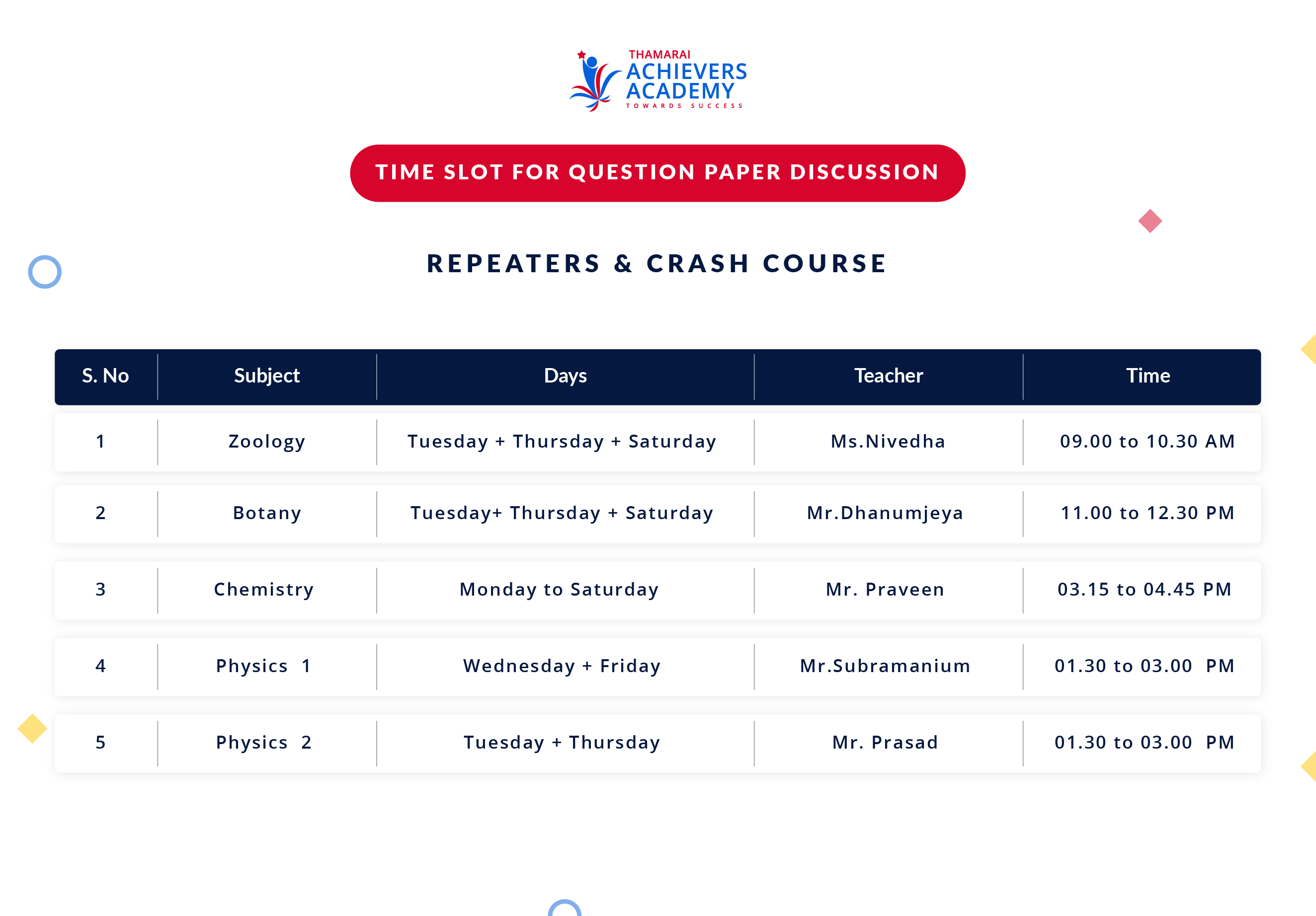‘Thamarai’ is a well known brand name in Delta region for producing the best results in almost all the competitive examinations. Over these 6 years,nearly 100 students have secured seats in MBBS course of Government Medical colleges and 17 have entered Government Dental colleges, (99% of the enrolled students have cleared NEET), 4 students have entered IIT, 14 in NIT Trichy, 1 in BITSAT(ie., 60% of the students have cleared IIT JEE (main) exam), 9 have passed UCEED exam, 2 have cleared KVPY and 8 students have cleared level 2 NTSE. TAA has given only a few samples of its success stories….unsaid success stories of TAA are more powerful.